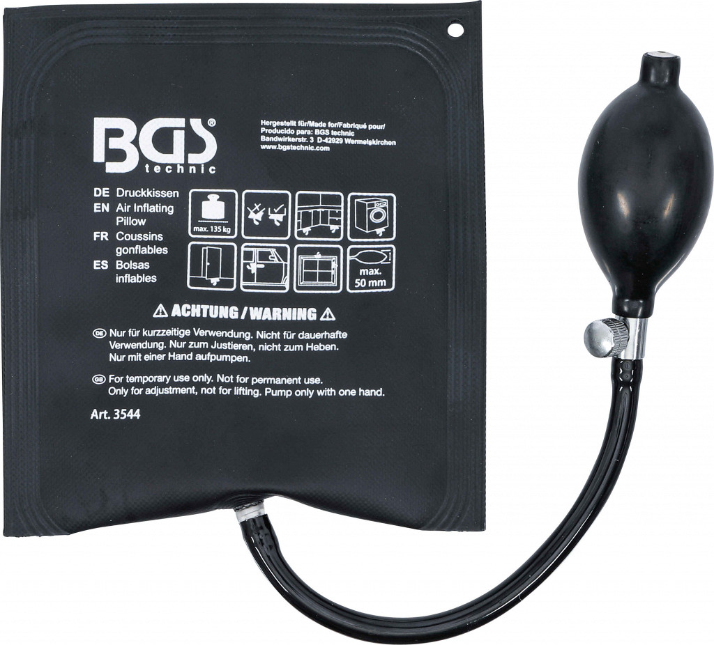 Za nepoškodljivo širjenje, npr. vratnih okvirjev pri nujnem odpiranju. Ročna črpalka z ventilom. Vsebina kompleta: 1 blazinica 160 x 160 mm, debelina 2 mm (brez zraka), 70 mm (napolnjena); 1 ročna črpalka s cevjo dolžine 350 mm.